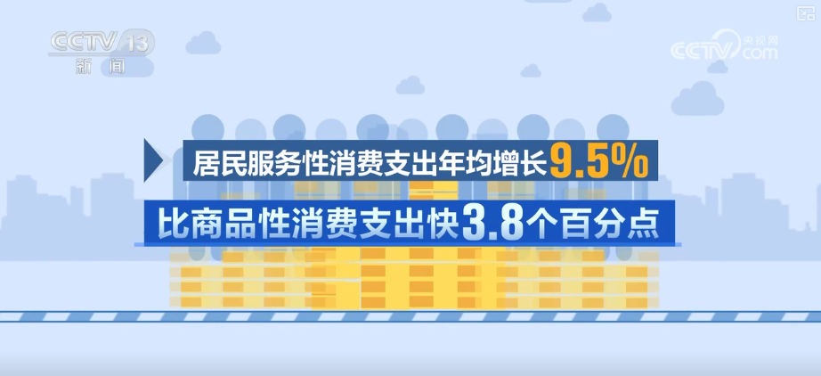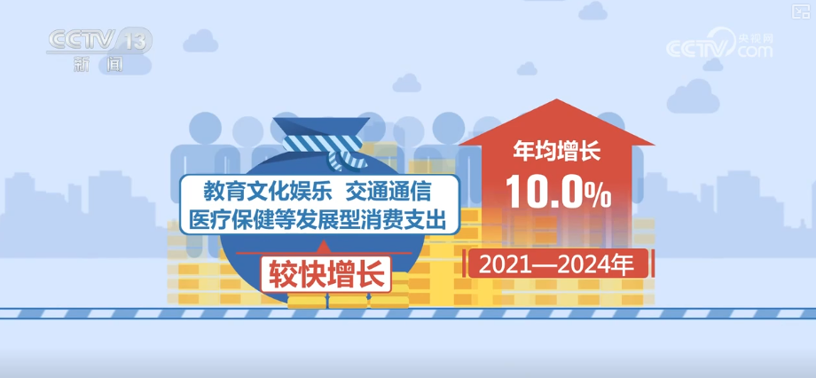 從支出看,教育文化娛樂、交通通信、醫療保健等發展型消費支出較快增長,2021—2024年年均增長10.0%;居民服務性消費支出年均增長9.5%,比商品性消費支出快3.8個百分點。