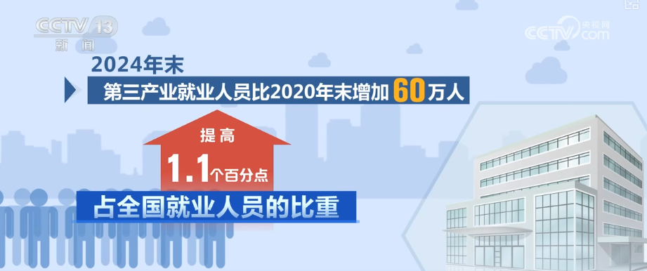 就業形勢總體穩定,城鎮就業人員繼續增長。2024年末,全國城鎮調查失業率均值為5.1%,比2020年下降0.5個百分點。第三產業吸納就業能力增強。2024年末,第三產業就業人員比2020年末增加60萬人,佔全國就業人員的比重提高1.1個百分點,第三產業就業“蓄水池”作用更加凸顯。