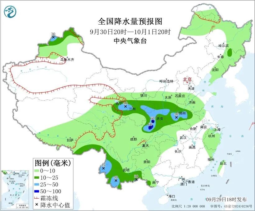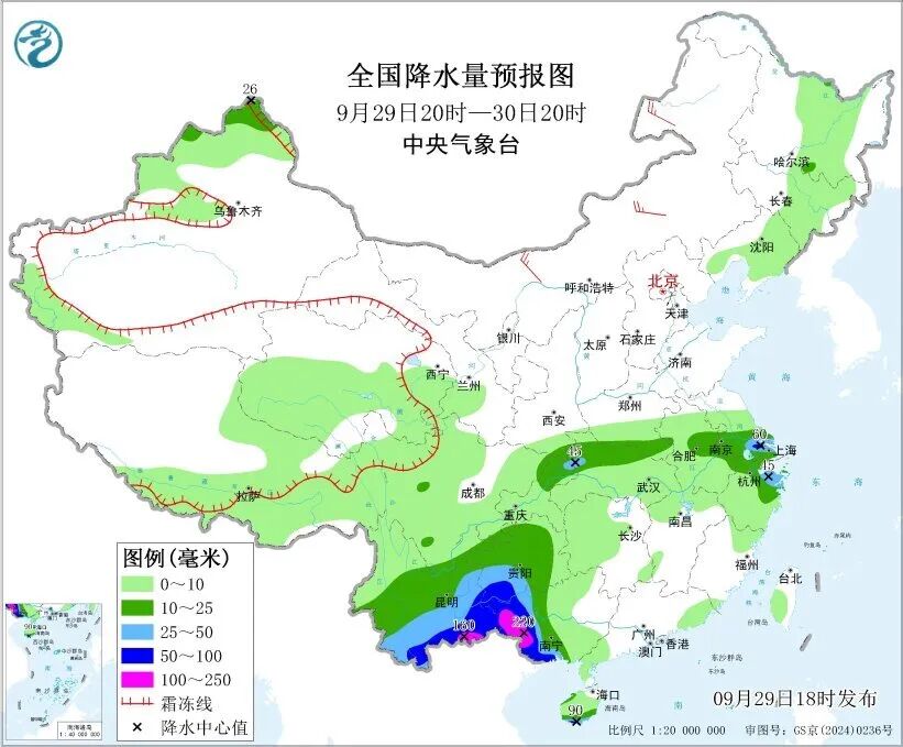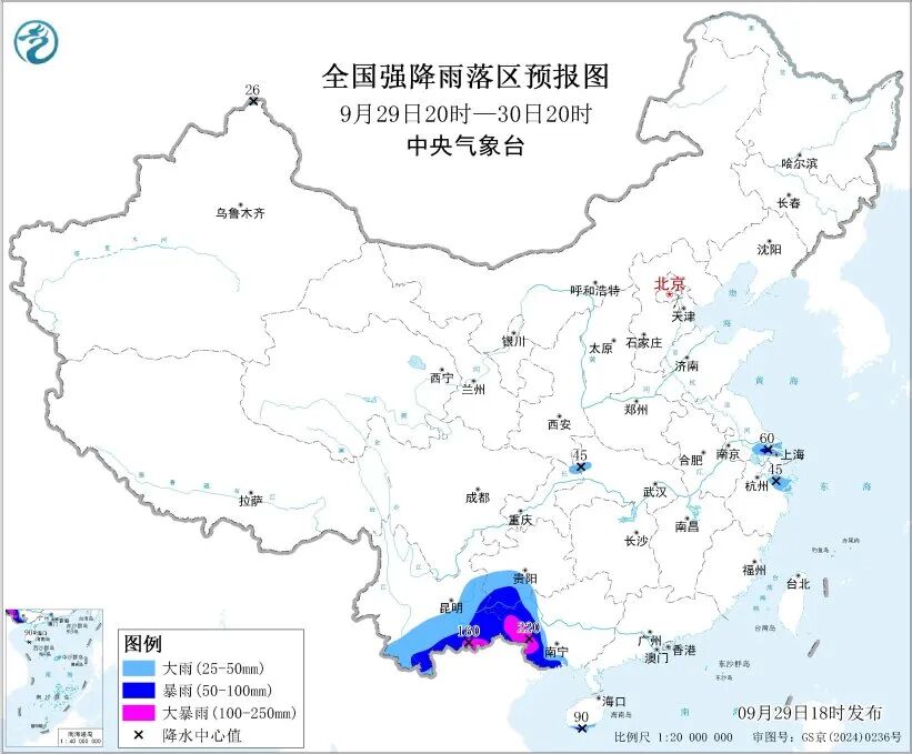 預計,9月29日20時至30日20時,海南島南部、廣西西部和南部、雲南東部和南部、貴州西部以及重慶北部、湖北西部、江蘇東南部、上海北部、浙江東北部等地的部分地區有大雨或暴雨,其中,廣西西部、雲南東南部等地局地有大暴雨。上述部分地區伴有短時強降水,局地有雷暴大風等強對流天氣。