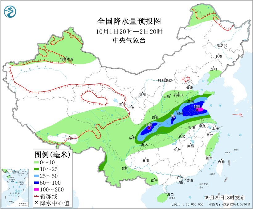預計,9月29日夜間至10月6日,華西地區、黃淮等地多降雨,甘肅東部、陝西中南部、四川東部、重慶西部和北部、湖北西部、河南、山東中南部、蘇皖中北部等地將有中到大雨,局地有暴雨或大暴雨。