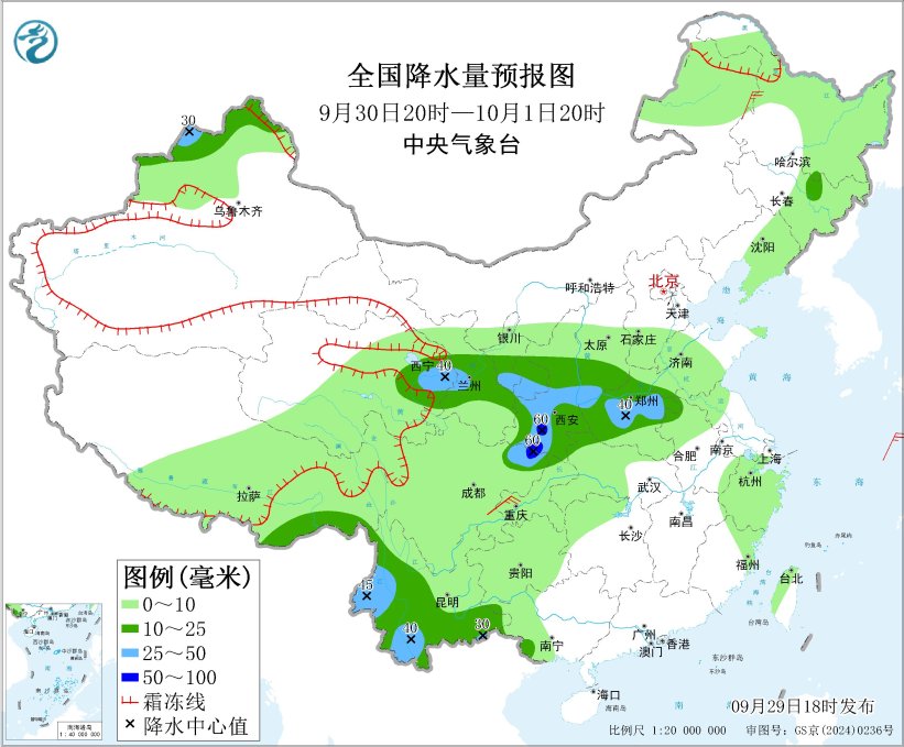 圖2 全國降水量預報圖(9月29日20時-30日20時)