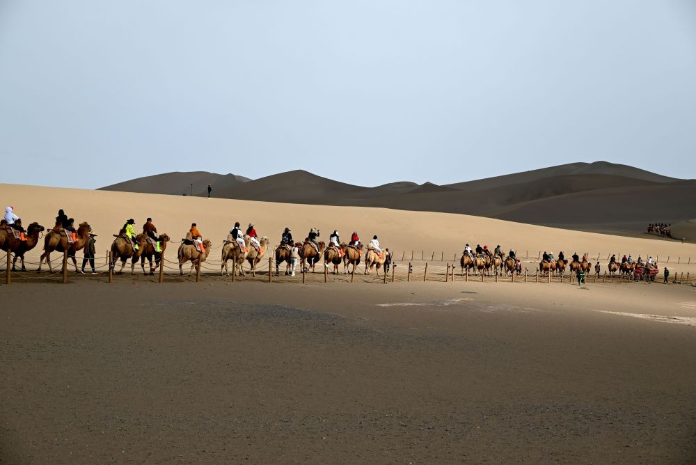 國慶、中秋雙節將至,節日氛圍日益濃厚,多地景區遊客增多,旅遊逐漸“升温”。圖為9月25日,遊客在甘肅省敦煌市鳴沙山月牙泉景區遊覽。新華社發(張曉亮攝)