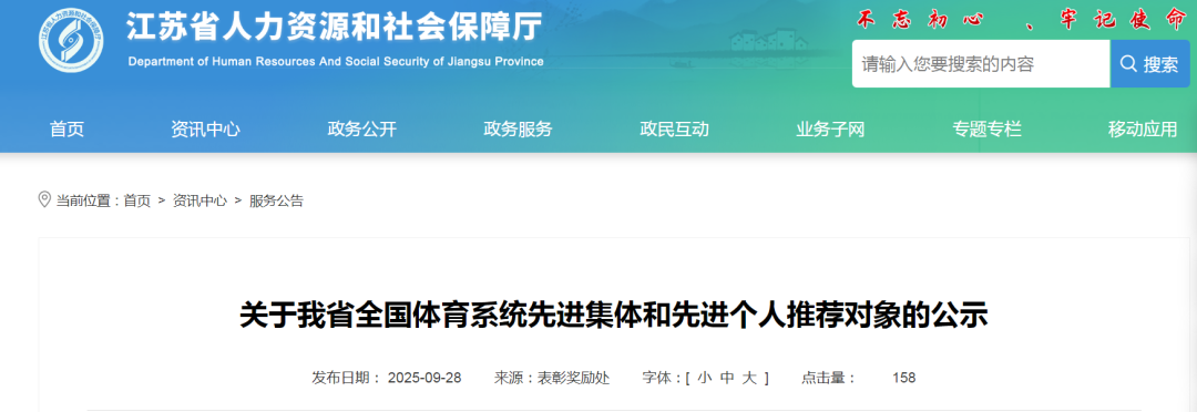 根據人力資源社會保障部、國家體育總局《關於開展全國體育系統先進集體和先進個人評選表彰的通知》(人社部函〔2025〕32號)要求,江蘇省人力資源社會保障廳、省體育局堅持公開、公平、公正原則,嚴格按照自下而上、逐級推薦、差額評選、民主擇優的方式,組織開展全國體育系統先進集體和先進個人推薦工作,經全國體育系統先進集體先進個人評選表彰工作領導小組初審通過,現將江蘇省擬正式推薦對象公示如下。