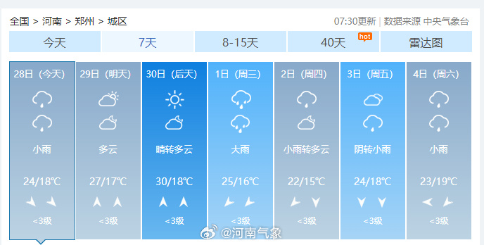 以省會鄭州為例,30日的最高氣温可達30℃,而到了6日,最高氣温將跌至18℃,假期末尾更是隻有16℃左右,涼意十足。