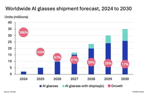 【環球網科技綜合報道】9月29日消息,Omdia發佈的報告顯示,AI眼鏡市場正迎來強勁增長,預計2025年全球出貨量將激增158%,達到510萬台。在谷歌、小米等頭部消費科技廠商加速入局的推動下,該市場預計在2026年突破1000萬台,到2030年將達到3500萬台,2025至2030年複合年增長率(CAGR)高達47%。
