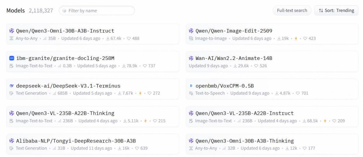 9月28日,全球最大AI開源社區Hugging Face公佈了新一期模型榜單,阿里通義7款模型入選全球前十開源模型榜單,幾乎實現屠榜,其中剛剛開源的全模態大模型Qwen3-Omni登頂。