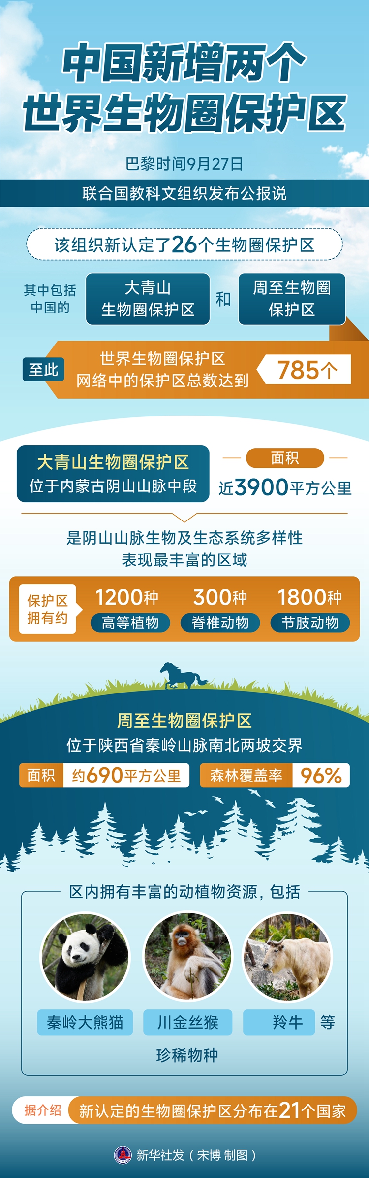 新華社巴黎9月27日電(記者羅毓)聯合國教科文組織27日發佈公報説,該組織新認定了26個生物圈保護區,其中包括中國的大青山生物圈保護區和周至生物圈保護區。至此,世界生物圈保護區網絡中的保護區總數達到785個。