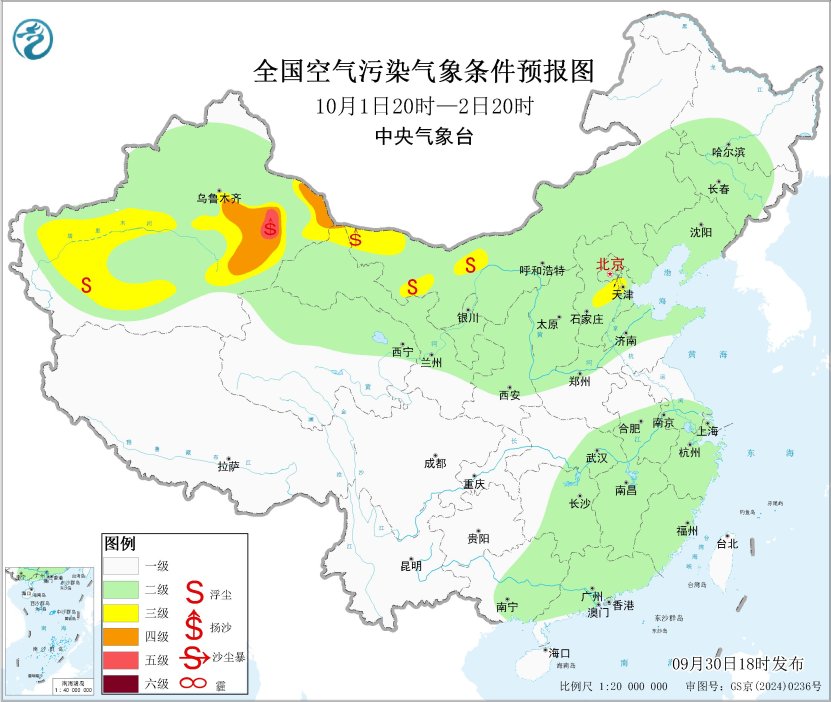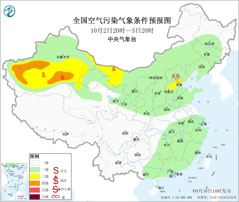 9月30日夜間至10月4日,華北中南部大氣擴散條件逐步轉差,河北中南部部分地區有輕度霾。此外,10月2日至4日,新疆南部和東部、甘肅西部、內蒙古西部等地的部分地區有揚沙或浮塵天氣。