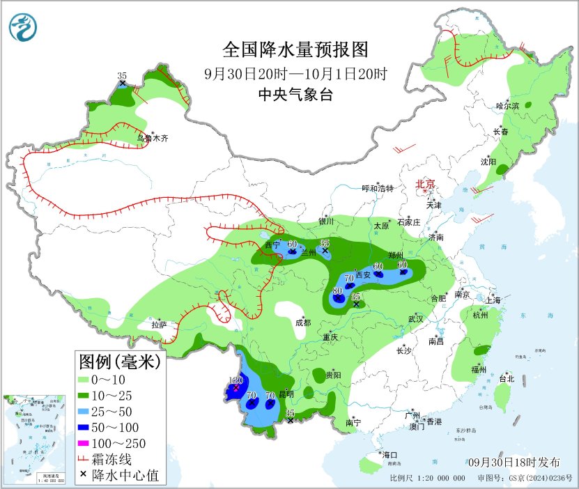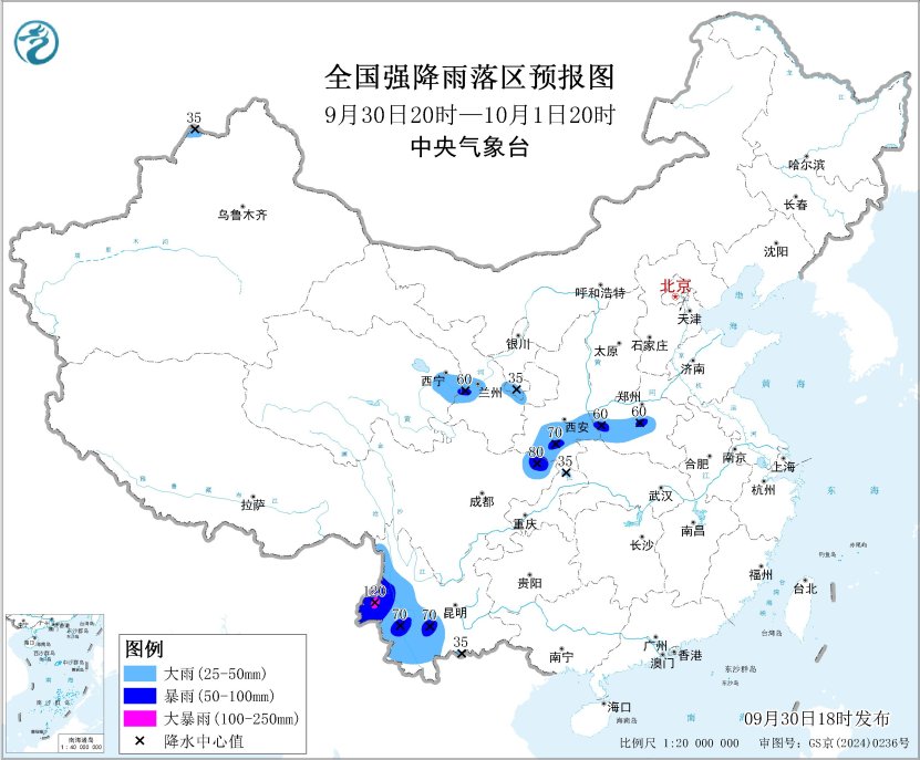 中央氣象台9月30日18時繼續發佈暴雨藍色預警*:*9月30日20時至10月1日20時,青海東北部、甘肅南部、寧夏南部、陝西南部、四川東北部、重慶北部、河南中西部、雲南中西部等地部分地區有大到暴雨,其中,雲南西部局部地區有大暴雨(100~120毫米)。上述部分地區伴有短時強降水(最大小時降雨量30~50毫米,局地可超過60毫米),局地有雷暴大風等強對流天氣。