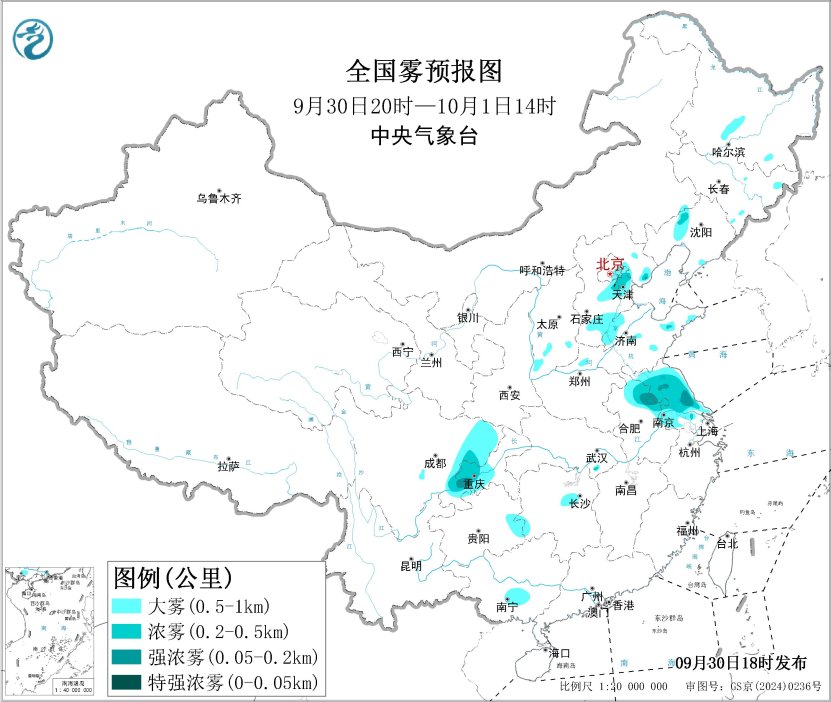 預計,9月30日夜間至10月1日上午,北京東部、天津、河北中南部、山東西北部、江蘇、安徽東北部、四川盆地東部、重慶西南部等地的部分地區有大霧,局地有能見度低於200米的強濃霧。中央氣象台9月30日18時發佈大霧黃色預警。