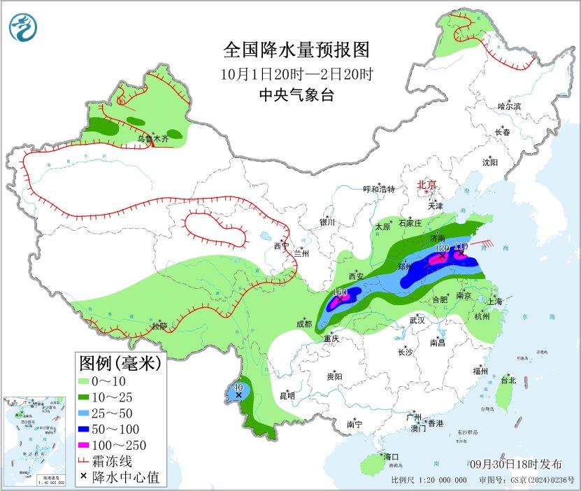 *9月30日20時至10月1日20時,*新疆北疆北部、青海東部、甘肅南部、寧夏南部、陝西中南部、四川東北部、重慶北部、河北西北部、河南中西部、貴州西南部、廣西西部、雲南大部等地部分地區有中到大雨,其中,甘肅南部、陝西南部、四川東北部、河南中西部、雲南中西部等地部分地區有暴雨,局地大暴雨(100~120毫米);新疆北部阿勒泰高海拔地區有中到大雪或雨夾雪,局地暴雪。新疆北疆北部、內蒙古中東部、黑龍江北部、遼東半島、山東半島等地部分地區有4~6級風;東海北部海域將有5~7級、陣風8級的大風(見圖3)。