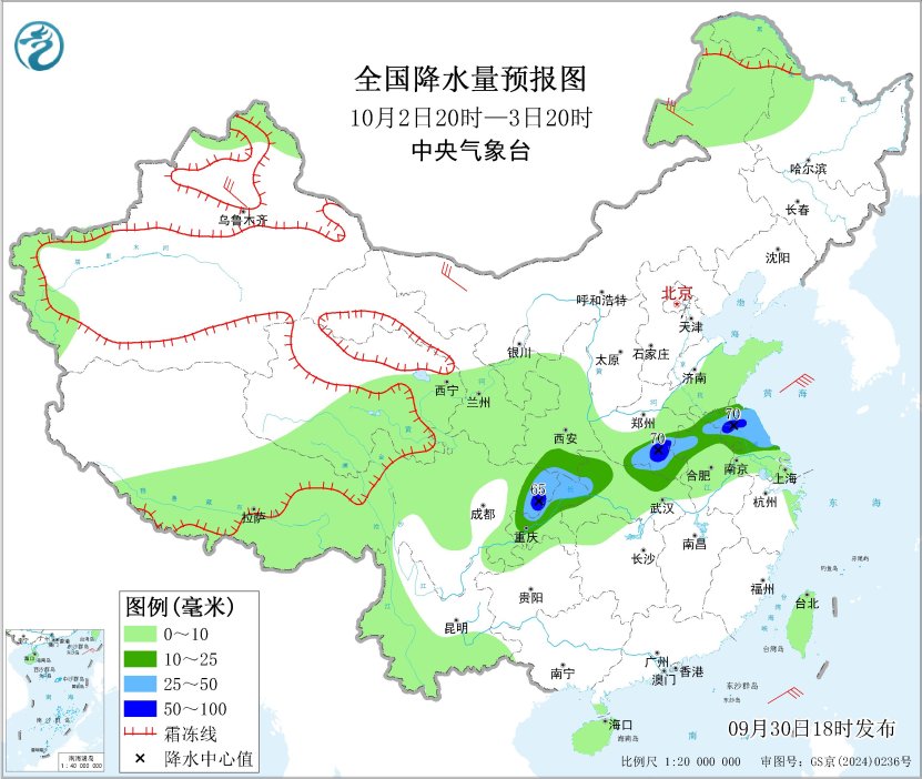 預計,9月30日夜間至10月5日,華西地區、黃淮等地多降雨,青海東部、甘肅東部、陝西中南部、四川東部、重慶西部和北部、湖北西部、河南、山東中南部、蘇皖中北部等地將有中到大雨,局地有暴雨或大暴雨。