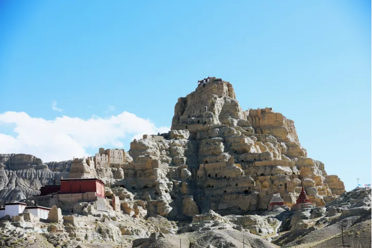古格王國遺址在阿里地區札達縣託林鎮札佈讓村兩公里外的一座土山上,海拔高度為3680米,佔地面積72萬平方米。遺址現存遺蹟羣有房(殿)址445間、窯洞(石窟)880孔、碉堡58座、佛塔28座等。