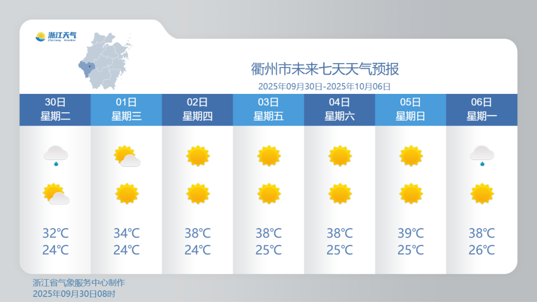 假期天氣總體利於出行,但是氣温方面就很頭疼了。明天還能享受冷空氣的餘威,但是從2日開始,大範圍的高温天氣又要捲土重來,我省氣温較常年偏高,最高氣温大部34-37℃局地38℃以上。特別點名衢州、麗水一帶,甚至可能會出現39℃的高温,這樣的國慶,真正是熱火朝天了。