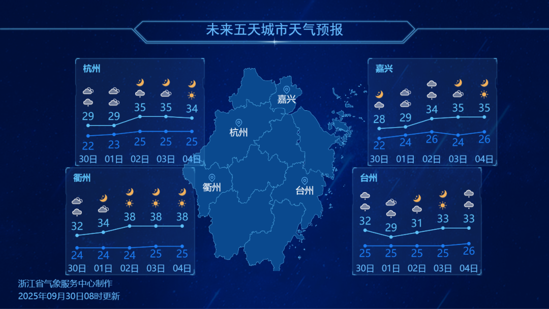 10月3日:浙北北部地區多雲,午後部分有雷陣雨;其它地區晴到多雲,午後有分散性雷陣雨。