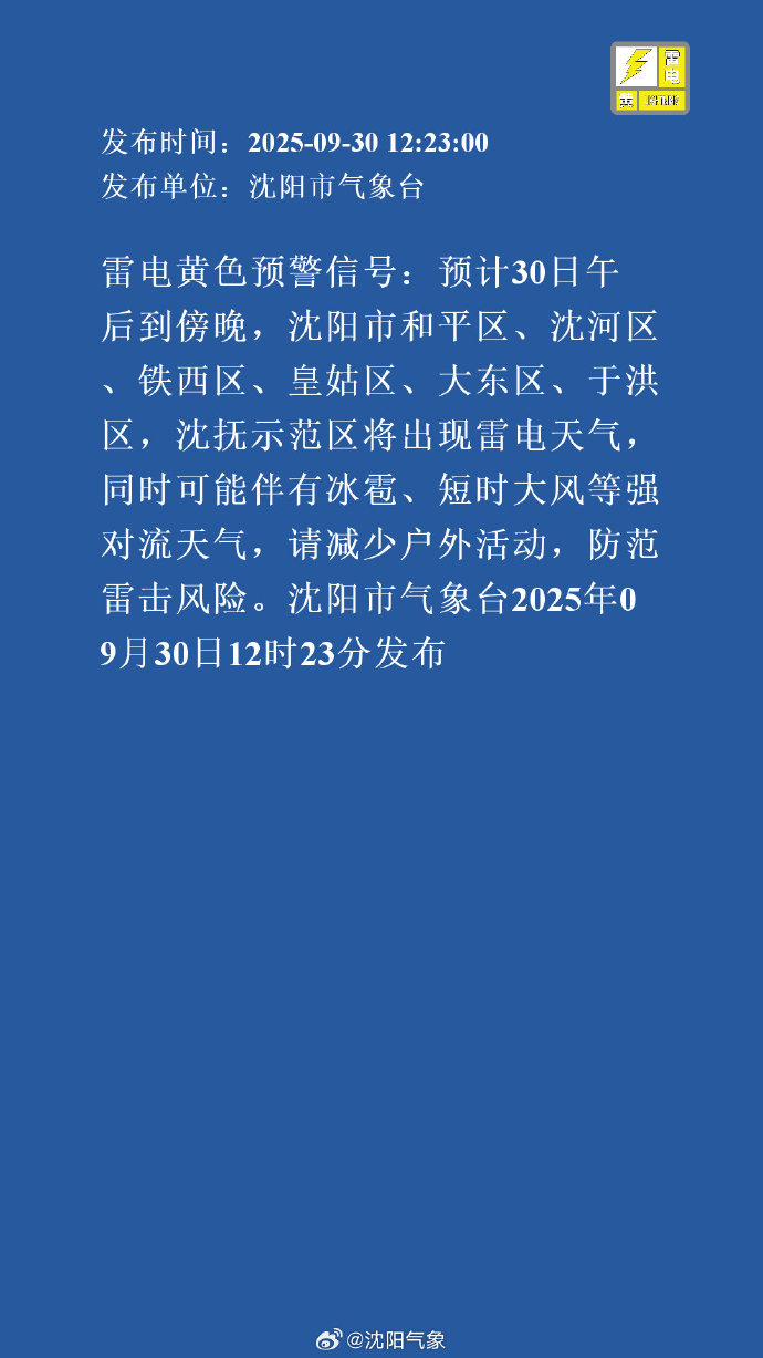 *瀋陽市氣象台12時56分發佈雷雨大風藍色預警信號:*預計未來1到3小時,瀋陽市和平區、瀋河區、鐵西區、皇姑區、大東區、于洪區,沈撫示範區將出現雷雨大風天氣,陣風風力可達8級以上,同時可能伴有冰雹等強對流天氣,請避免户外活動,防範大風、雷擊、冰雹等風險。