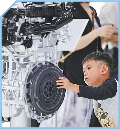 智能網聯新能源汽車展區,小朋友在觀察汽車發動機。