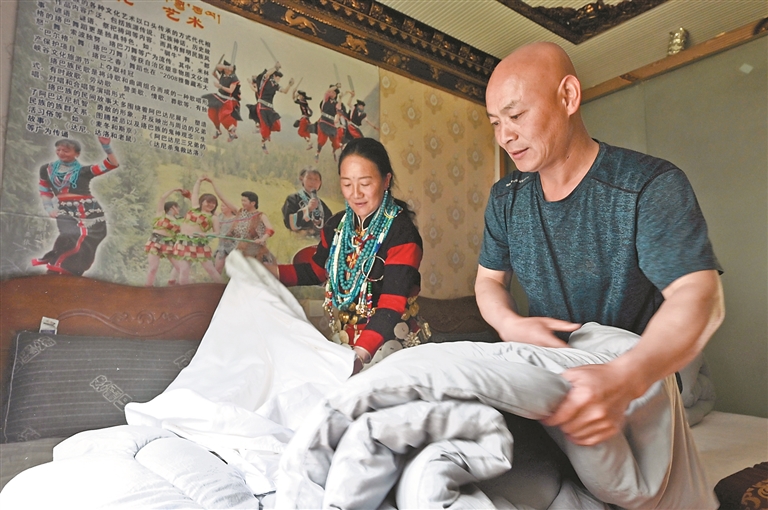 米林市南伊珞巴民族鄉,亞達兒與丈夫鄭定全在整理民宿房間。記者 白瑪澤旺 攝