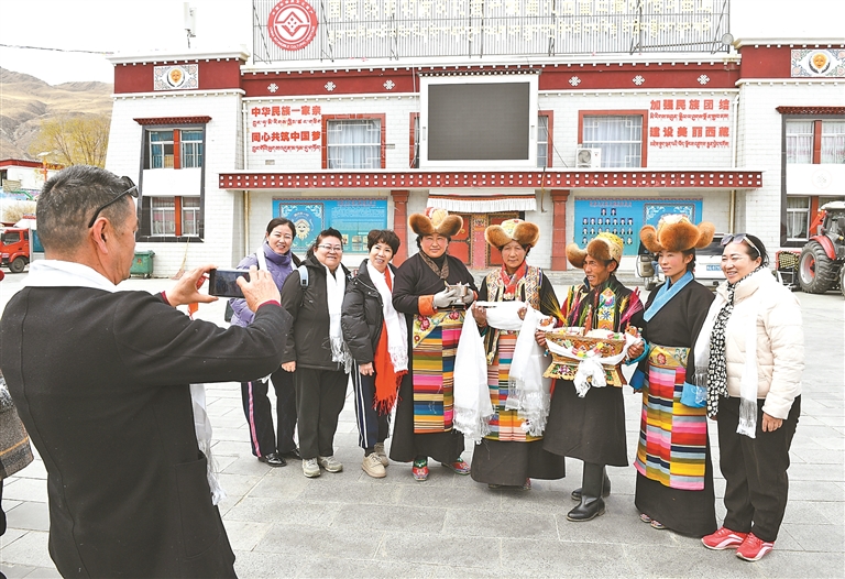 遊客在山南市乃東區扎西曲登社區合照留念。