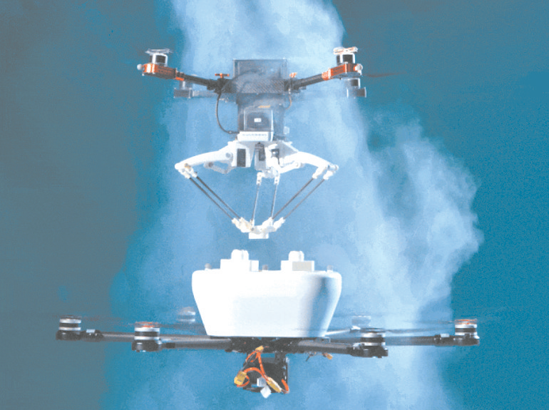 然而,無人機空中“遞工具”的想法面臨一個關鍵技術難題:如果兩架多旋翼無人機要交換有效載荷,需要採取“疊飛”的形式,即一架無人機先飛到另一架無人機的上方,再交換工具。但當兩架無人機上下“疊飛”時,上方的無人機會向下吹出強烈的“下洗氣流”,嚴重干擾無人機的穩定性。