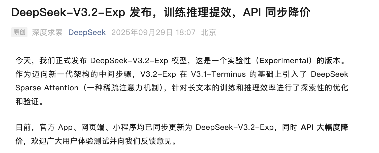 DeepSeek-V3.2-Exp模型正式發佈並開源 API大幅度降價