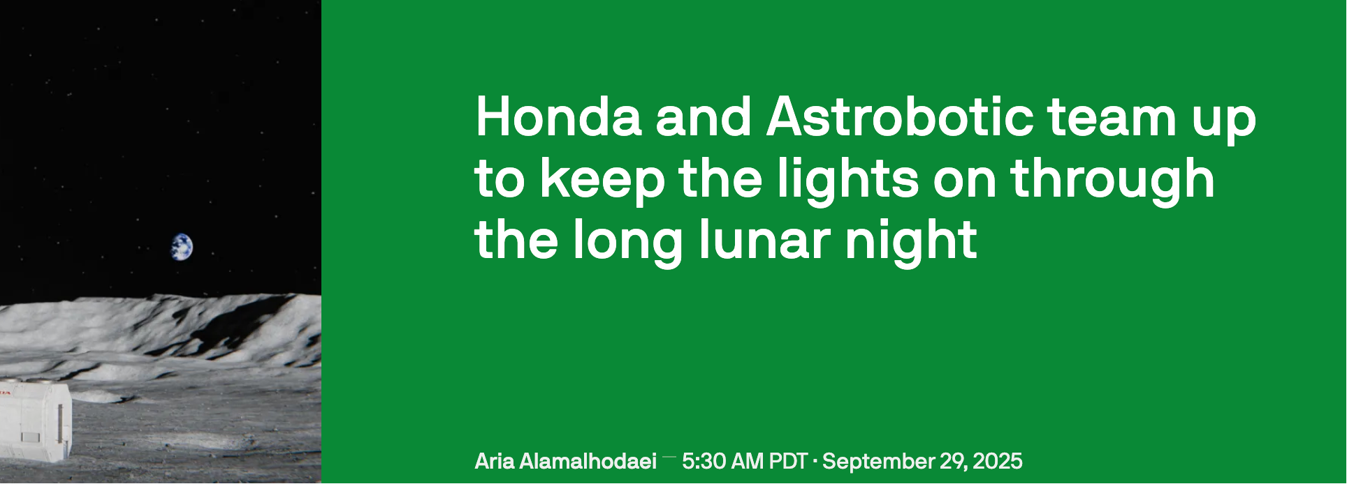 【環球網科技綜合報道】9月30日消息,據科技媒體TechCrunch報道,日本汽車巨頭本田與美國登月技術初創公司Astrobotic達成跨界合作,共同研發適用於月球極端環境的再生燃料電池太陽能照明系統,旨在通過創新能源組合,實現月球南極永久陰影區的持續供電,改變人類對月球極夜“黑暗禁區”的認知。