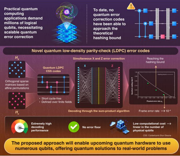 日本東京理科大學團隊在量子糾錯技術方面取得重要突破:開發出一種高效且可擴展的量子低密度奇偶校驗(LDPC)糾錯碼,在包含數十萬個邏輯量子比特的系統中仍保持極高的穩定性,性能接近理論界限。這一成果為實現大規模容錯量子計算提供了關鍵技術支撐,有望推動量子計算機在量子化學、密碼分析和複雜優化等領域的實際應用。