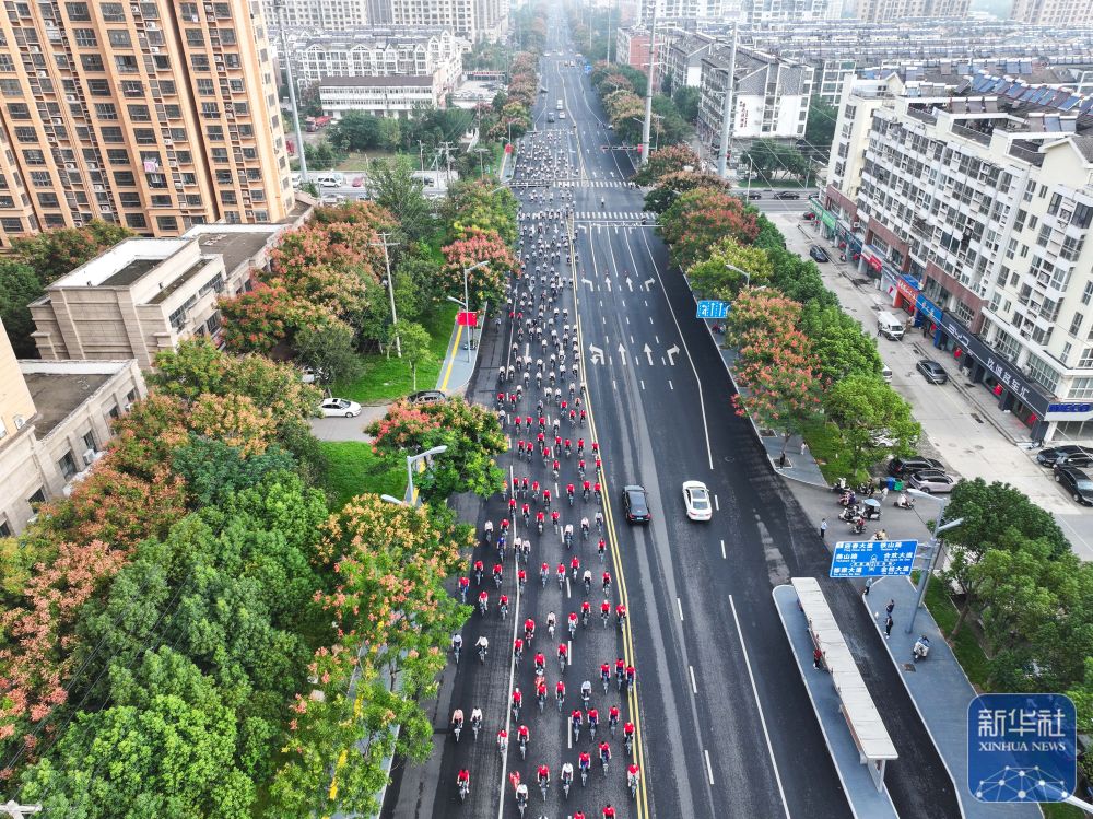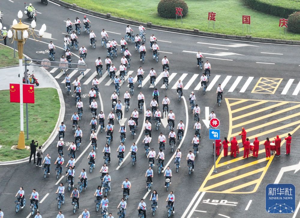 ↑ 10月1日,江蘇省淮安市盱眙縣舉行“共賀祖國華誕”綠色騎行活動,參與者騎車出發。新華社記者 季春鵬 攝