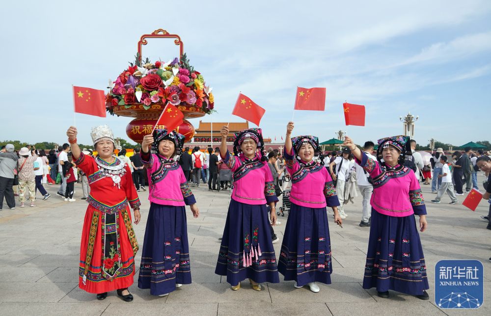 ↑ 10月1日,來自貴州的布依族遊客在北京天安門廣場遊覽拍照。新華社發(梁志強攝)