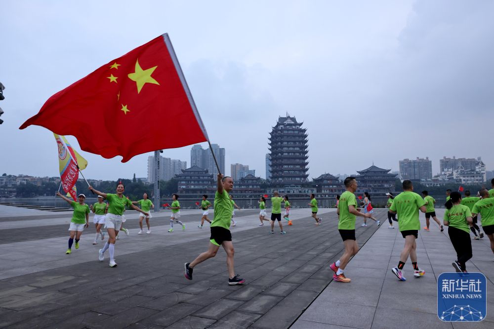 ↑ 10月1日,在四川省眉山市東坡城市濕地公園,健跑愛好者參加慶祝祖國華誕的“10.01公里”長跑活動(無人機照片)。新華社發(姚永亮攝)