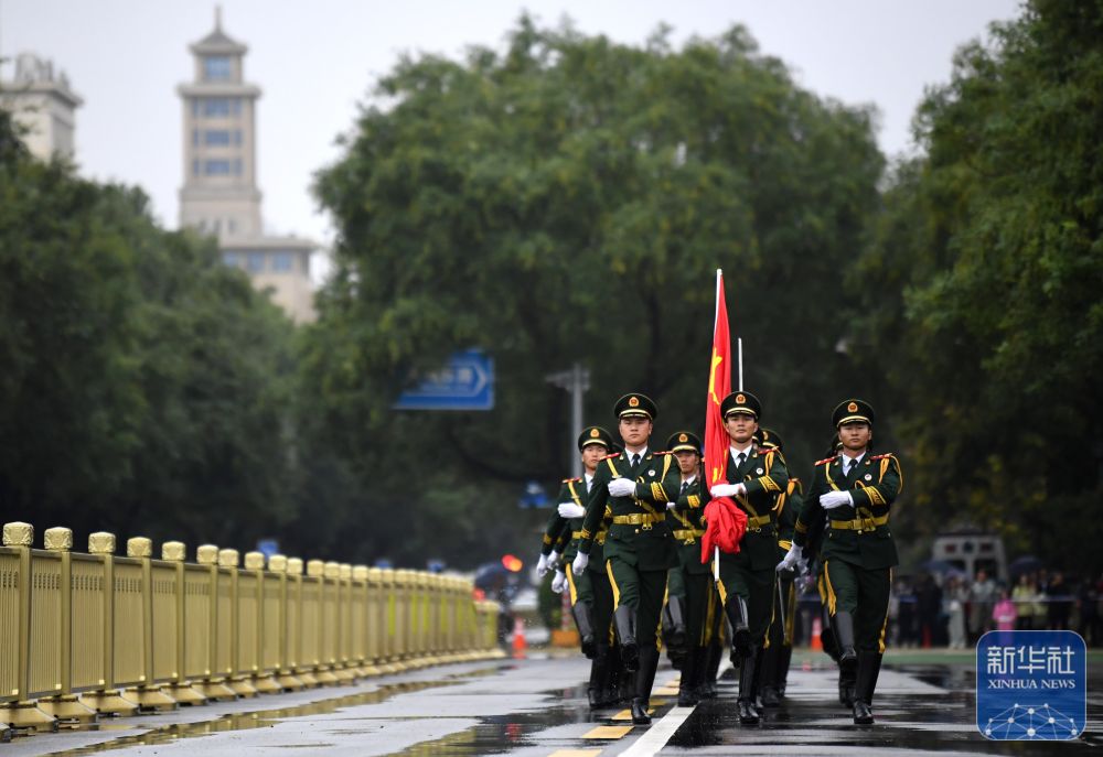 ↑ 10月1日在陝西省西安市新城廣場拍攝的升旗儀式。新華社記者 李一博 攝