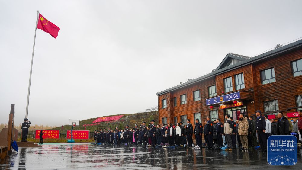 ↑ 10月1日在新疆阿勒泰邊境管理支隊喀納斯邊境派出所拍攝的升旗儀式。新華社發(王友波攝)