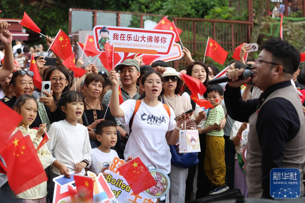 ↑ 10月1日,遊客在四川省樂山市大佛景區佛頭廣場合唱歌曲《我和我的祖國》。新華社發(李華時攝)