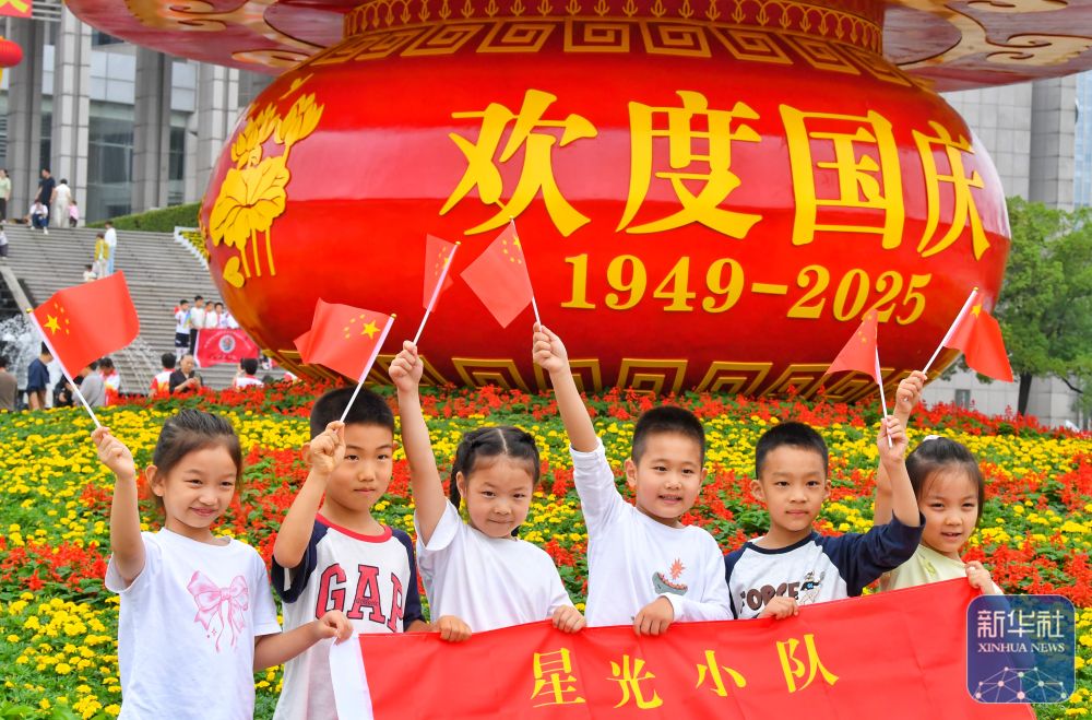 ↑ 10月1日,小朋友在安徽省合肥市蜀山區市民廣場國慶主題花籃前拍照。新華社發(陳三虎攝)