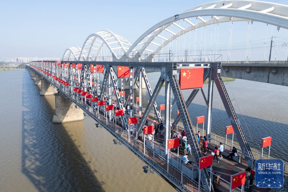 ↑ 10月1日,遊客在哈爾濱市濱州鐵路橋上游覽。新華社記者 張濤 攝