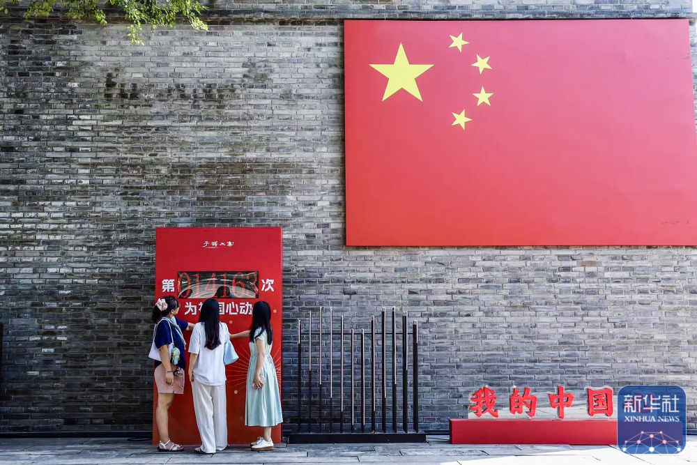 ↑ 10月1日,在浙江嘉興市南湖區建設街道子城城牆邊,市民與國旗合影。新華社記者 徐昱 攝