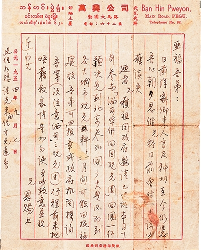廼者兄獲祖國政府邀請,已決於本月下旬參與“緬甸華僑回國觀光團”回國一行,預決先到北京參加國慶大典,後即到各大城市觀光,料十一二月間可能回抵福建,故吾弟可由報章或政府機關探詢吾等(須注意“緬甸”之觀光團)行程,前來把晤,藉敍家情,是切勿誤。