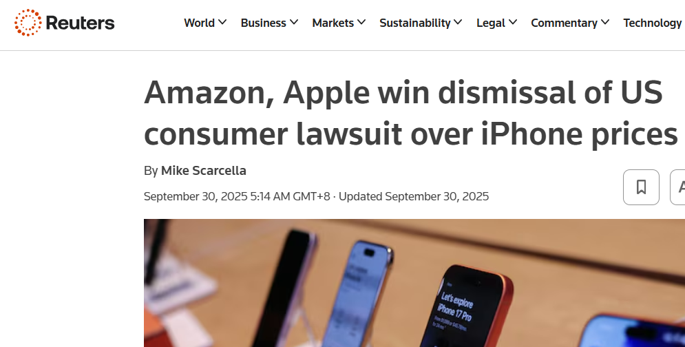 據路透社10月1日消息,科技巨頭蘋果與電商巨頭亞馬遜日前在一場消費者反壟斷訴訟中勝訴,美國西雅圖聯邦法院駁回了針對兩家公司合謀抬高iPhone和iPad價格的指控。