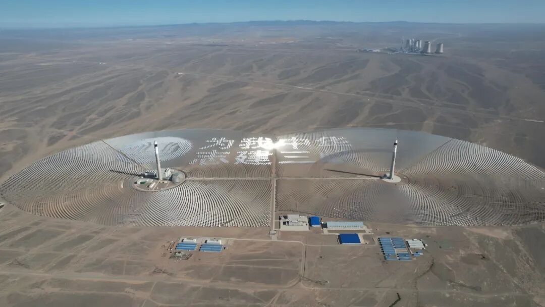 該光熱儲能電站裝機容量10萬千瓦,首次採用“兩座吸熱塔+一套汽輪發電機組”的創新配置。項目現場,兩座吸熱塔東西佈置相距約1千米。吸熱塔周圍,近2.7萬面定日鏡組成東西兩座部分重疊的圓形鏡場,總採光面積達80萬平方米。鏡面採用特殊超白玻璃,反射效率達94%,可跟蹤太陽轉動。