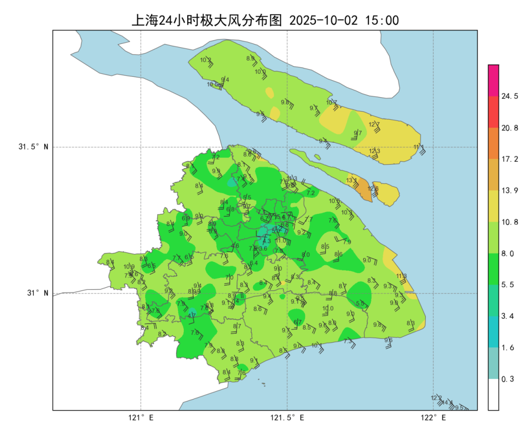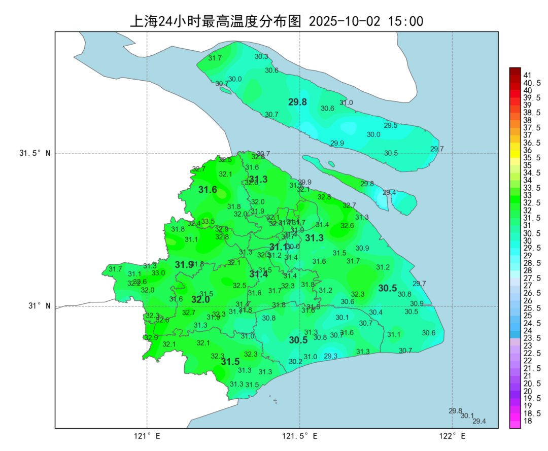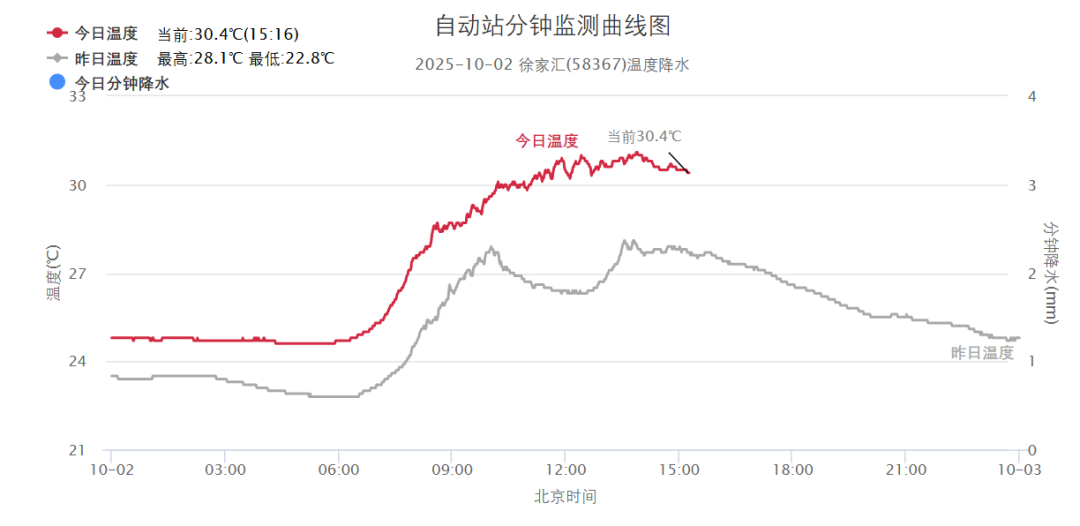 受低壓東移影響,今天上海東南風陣陣,白天陽光時隱時現,局部出現了短時陣雨,降水範圍小雨勢弱。午後氣温較高,市區徐家彙站最高氣温定格在31.1度。