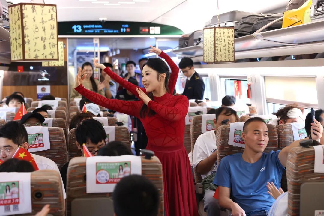 列車上,舞蹈《雙面燕洵》率先上演,西安客運段乘務員李亞娟和宜路行公司餐服員楊紫怡着唐裝起舞,再現盛唐風華,引得旅客紛紛鼓掌叫好。隨後,列車長劉晨介紹雙節假期便民服務措施,讓旅客暖心。
