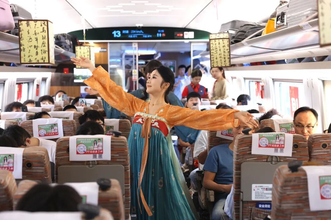 走進G828次列車時,我恍惚踏進一個時空交錯的夢境。唐風少女的披帛掃過金屬扶手,李白的廣袖拂過藍色座椅,窗外是呼嘯而過的電線杆,窗內“雲雀鏡”映着現代人的臉龐。
