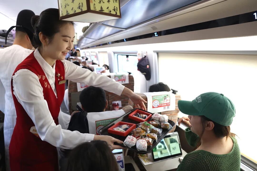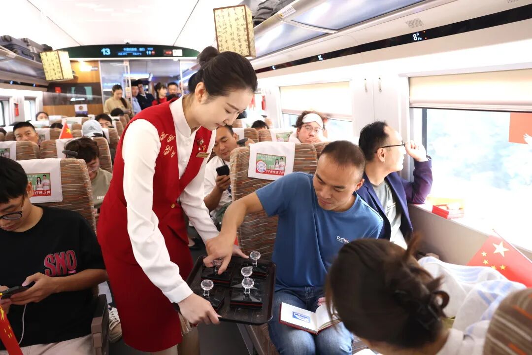 魔術師抖開綢緞,變出秦嶺的雲嵐;乘務員起舞時,裙襬綻開大明宮的秋海棠。當《我和我的祖國》的旋律響起,我看見對面香港旅客眼角閃動的淚光——此刻我們同在一條鋼軌上,共守着這片月圓的土地。