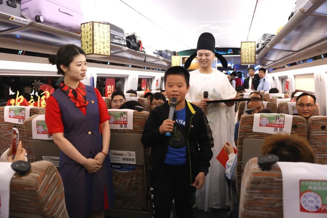 在“太白對詩”互動環節,西安客運段工作人員楊凌霄扮演的“詩仙李白”提問與列車途經城市相關的詩句,旅客踴躍接句,答對的小朋友贏得全場掌聲。