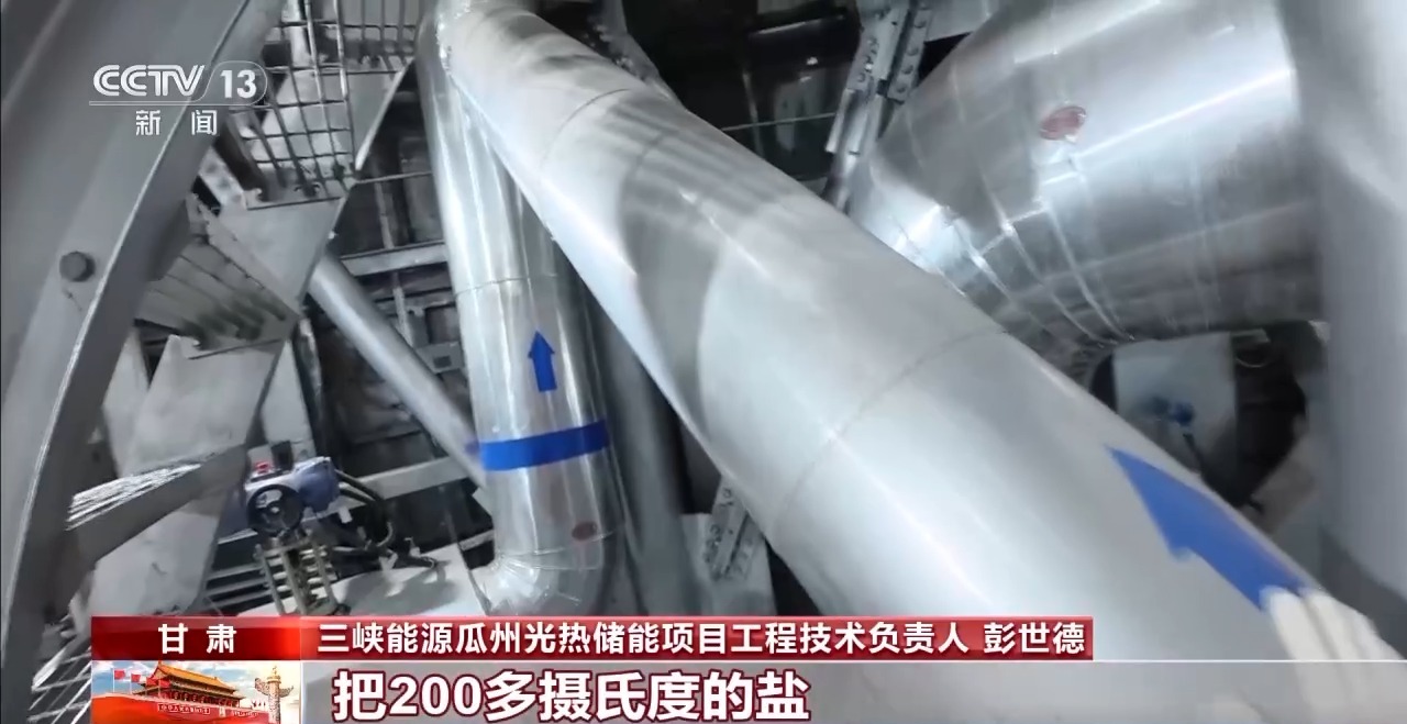*三峽能源瓜州光熱儲能項目工程技術負責人 彭世德:*伴熱系統在給管道進行預熱,藍色的是低温管道,把200多度的鹽,從冷鹽罐裏面運輸到塔上,紅色管道是把加熱完後的600多度的鹽,送到塔下的罐裏面,形成一套循環系統。和以前用的太陽灶一樣,只不過是我們把水換成了熔鹽。