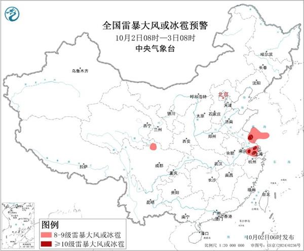 *強對流天氣藍色預警:*預計10月2日8時至3日8時,江南東北部、江淮東部等地的部分地區將有8級以上雷暴大風或冰雹天氣,其中,江蘇東部和南部等地的部分地區將有10級以上雷暴大風,最大風力可達11級以上;西南地區東北部、江漢西部、江淮中部和東部、江南東北部、海南島等地的部分地區將有小時雨量大於20毫米的短時強降水天氣,其中,江蘇東部和南部、湖北西南部、浙江北部、重慶東北部等地的部分地區小時雨量大於50毫米,最大可達60毫米以上。