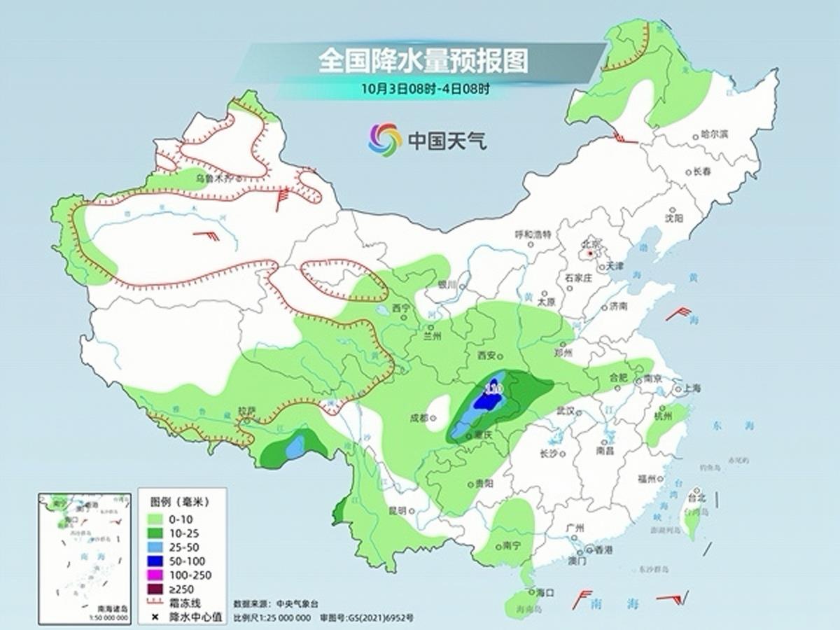 今起三天(10月2日至4日),華西至黃淮一帶依然陰雨連連,四川、陝西、河南等地部分地區累計雨量大,需警惕暴雨致災。同時,華北、東北多地暖熱持續,江南、華南有持續性高温天氣。