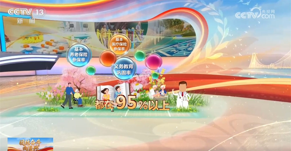 這五年,經濟發展、科技進步的成果實打實地轉化為羣眾的獲得感和幸福感。我國已建成全球規模最大的教育體系、社會保障體系、醫療衞生體系,義務教育鞏固率和基本養老保險、基本醫療保險參保率都在95%以上。
