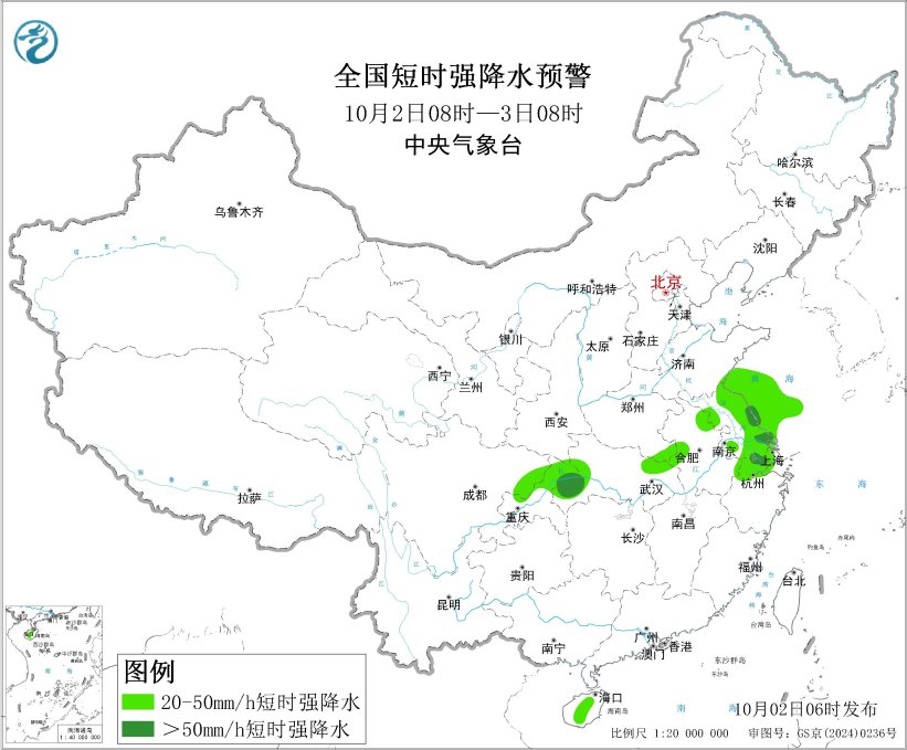 預計10月2日08時至3日08時,江南東北部、江淮東部等地的部分地區將有8級以上雷暴大風或冰雹天氣,其中,江蘇東部和南部等地的部分地區將有10級以上雷暴大風,最大風力可達11級以上;西南地區東北部、江漢西部、江淮中部和東部、江南東北部、海南島等地的部分地區將有小時雨量大於20毫米的短時強降水天氣,其中,江蘇東部和南部、湖北西南部、浙江北部、重慶東北部等地的部分地區小時雨量大於50毫米,最大可達60毫米以上。