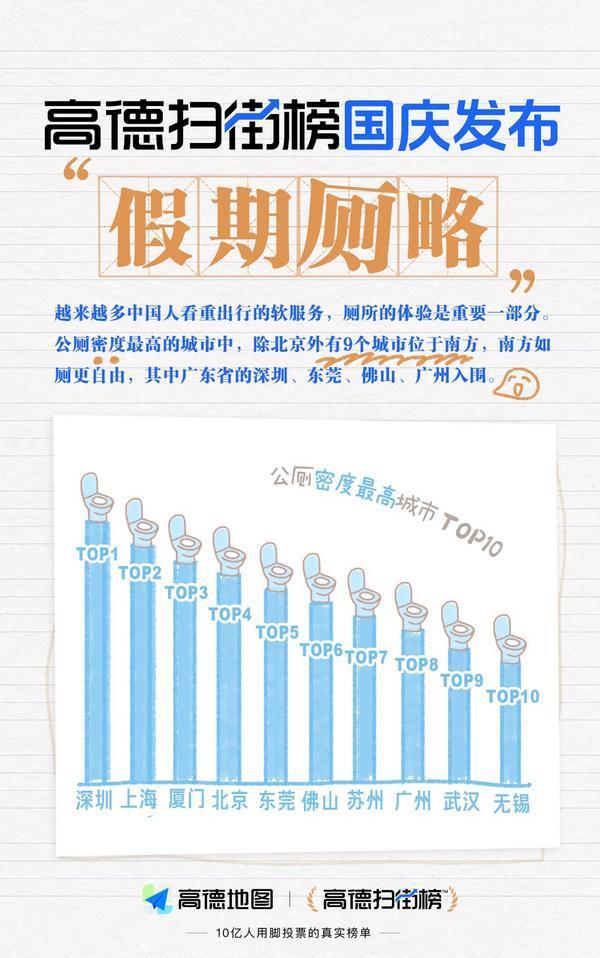 高德掃街榜發佈假期“廁略” 公廁數前十城市南方佔9個